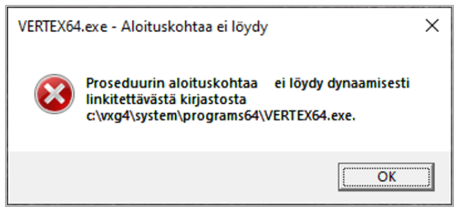 Vertex G4 ei aukea tuplaklikattaessa ikonia. Näyttöön tulee oheinen virheilmoitus, Proseduurin aloituskohtaa ei löydy dynaamisesti linkitettävästä kirjastosta