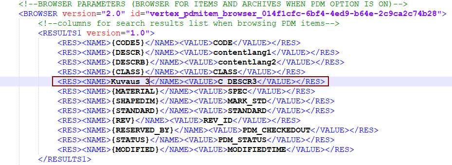 Tässä esimerkissä nimikkeelle on tehty uusi kenttä C_DESCR3. Uuden kentän perustaminen löytyy kb.vertex.fi ohjeesta.