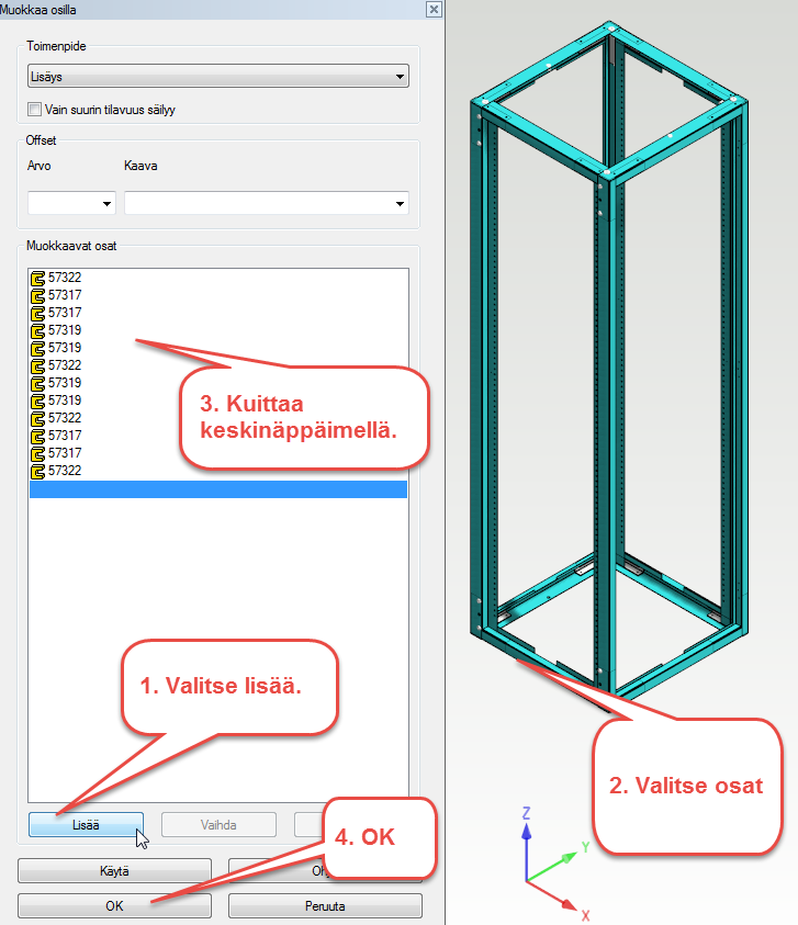 Valitse tilannekohtainen toiminto: Muokkaa osilla.