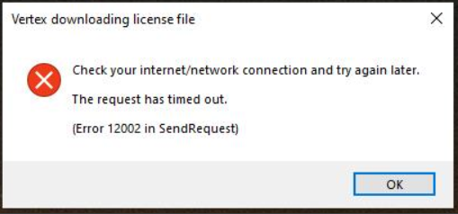 Ohjelma ei saa yhteyttä Vertexin lisenssipalvelimelle. Vertex downloading license file error.