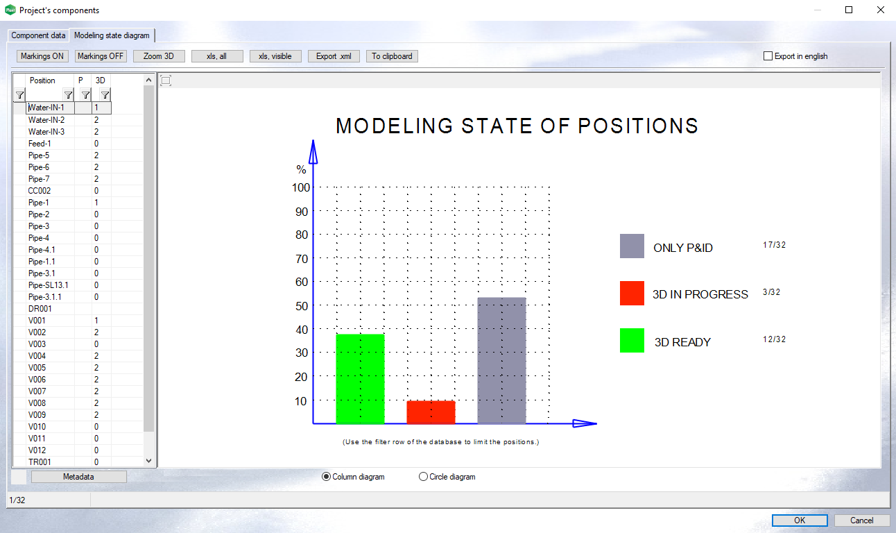 It's now possible to follow and report the modeling state of the project. The new function collects the modeling state of each line position and reports them in a new database view. Open the database view by clicking the function Selected all / Modeling state diagram. You can view the modeling state in column and circle diagrams. (PLANT-3373)