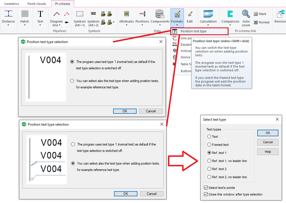 You have now a possibility to select the text type of the position text while you are labeling new positions. You can still use the old method. The name of the new setting is Position text type and you can locate it under the drop-down menu Formats. (PLANT-3728)