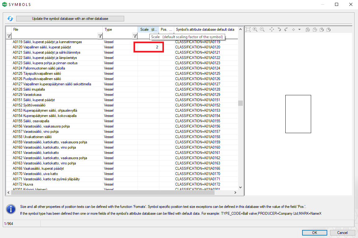 Define a default scale factor for each PI symbol. You can locate this feature from Symbol types (Symbols > Symbol types). Define the scaling factor for each symbol to the field Scale. (PLANT-3842)