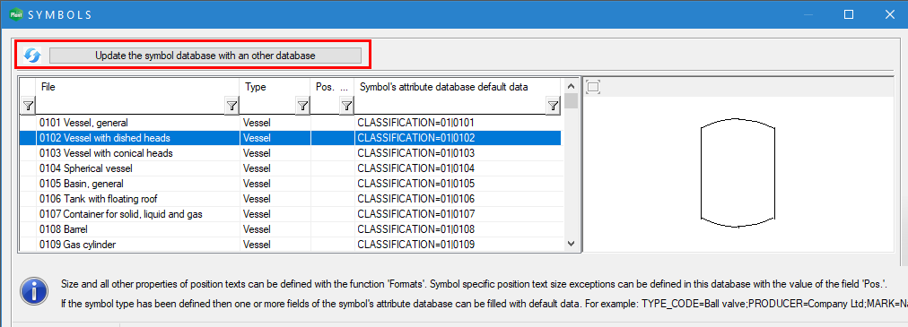 An update function has been added to allow users who have created their own symbols in the d_SYMBOLTYPE database to update the new symbols that came with the delivery environment in their /custom/dbases/ database. The function is similar to that which already existed for pipe components, pipe classes, and pipe options. (PLANT-3454)