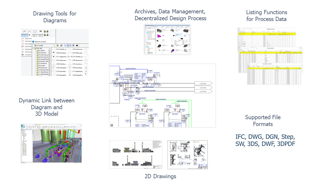 You can easily modify the diagram data by double-clicking a single element from the diagram. The other option to modify the data is to open the project-specific database view. You can also export the data from the database to Excel, modify it in Excel and then import the modified data back to the database. The program updates the diagrams and its texts and tables automatically after you have saved your changes. You can create pipeline, equipment, instrument and device lists from the whole project's diagram data.