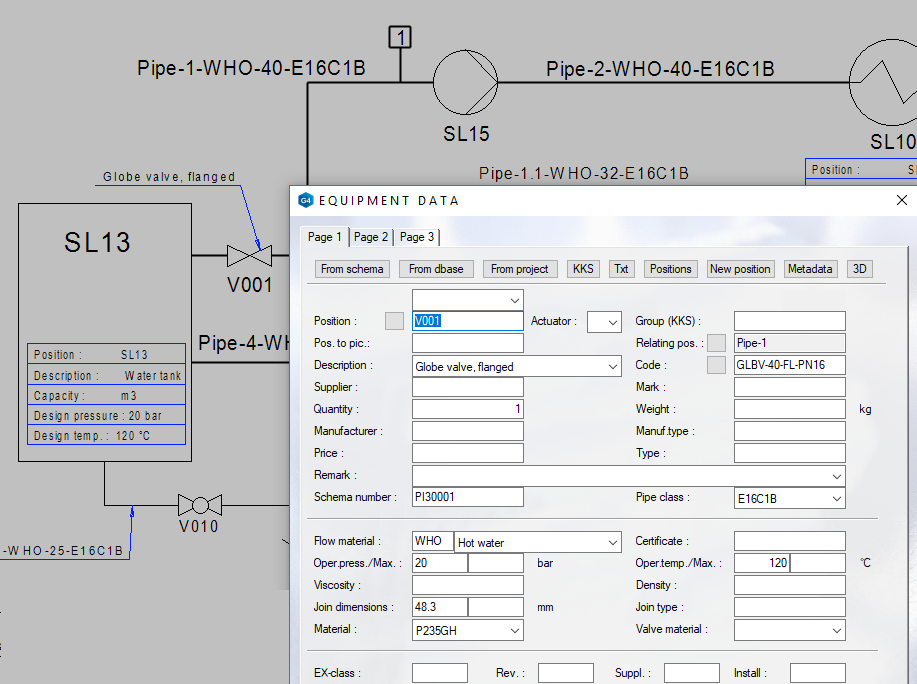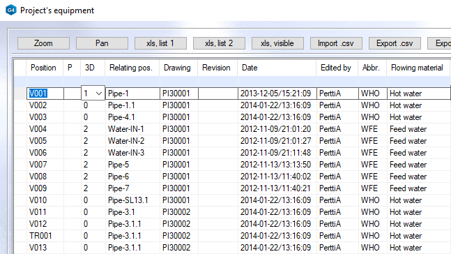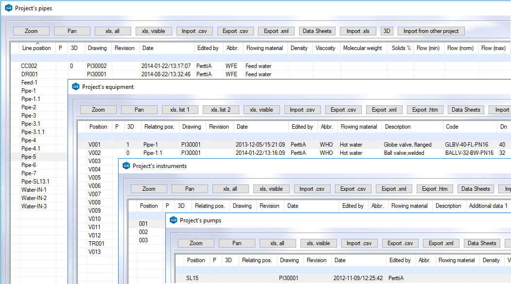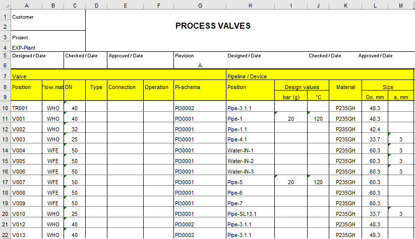 You can define positions and process data to diagram elements by double-clicking them. The process data you have defined is stored to project-specific databases for each element type like pipes, equipment, instruments, devices and so on. You can view and list your process data afterward. These project-specific databases collect all process data which you define to your diagrams in that project and you can export all data directly from the database views without opening the actual diagrams one by one. You can export the data to Excel templates, for example.
