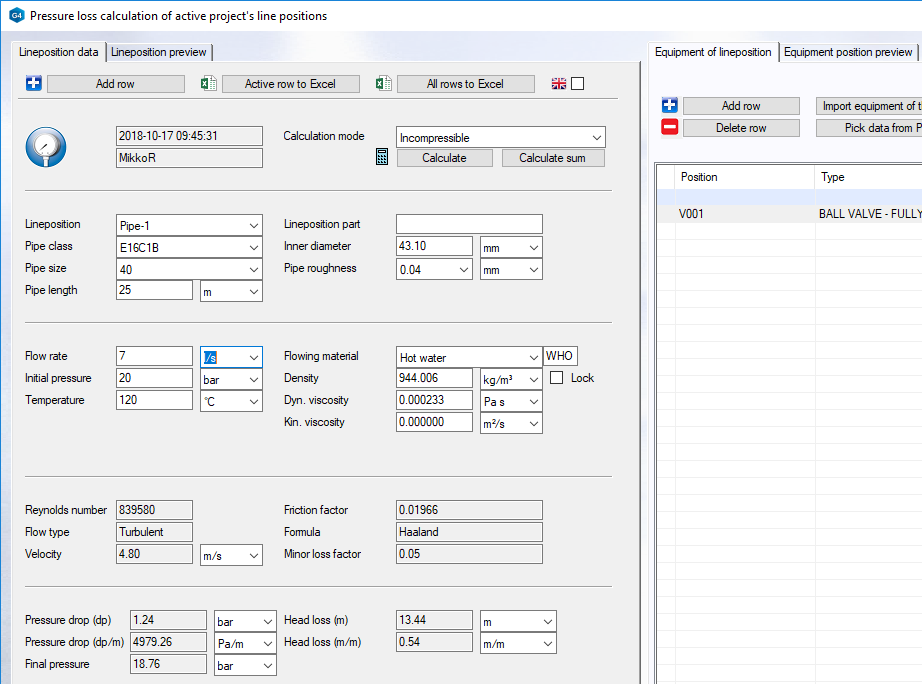Examine pressure drops of your pipelines in the diagram by using the chosen flow rate. You can define initial data like the surface roughness of the pipes and minor loss coefficient of each component.