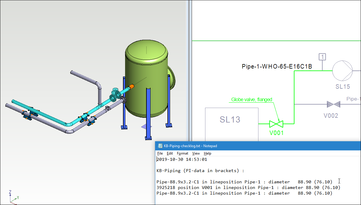 Find elements and compare data between P&ID diagram and 3D model.
