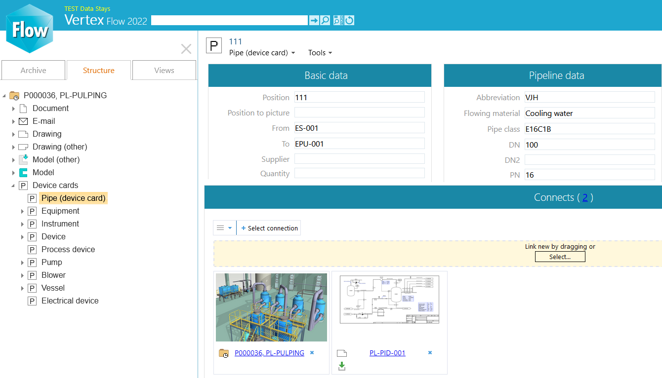 The new device card is automatically connected to its P&I diagram in Flow. The pipeline which is part of many diagrams is connected to each one of them automatically. This helps the Flow viewer to find the correct diagram much easier while browsing device cards in Flow.