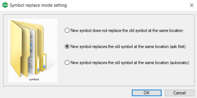 You can replace a P&ID symbol by adding the symbol over an existing one. The P&ID data entered for the old symbol is automatically copied to the new symbol. Previously, this functionality had to be turned on separately with the Symbol Replace Mode Setting function. Now the default option is New symbol replaces the old symbol at the same location (ask first).