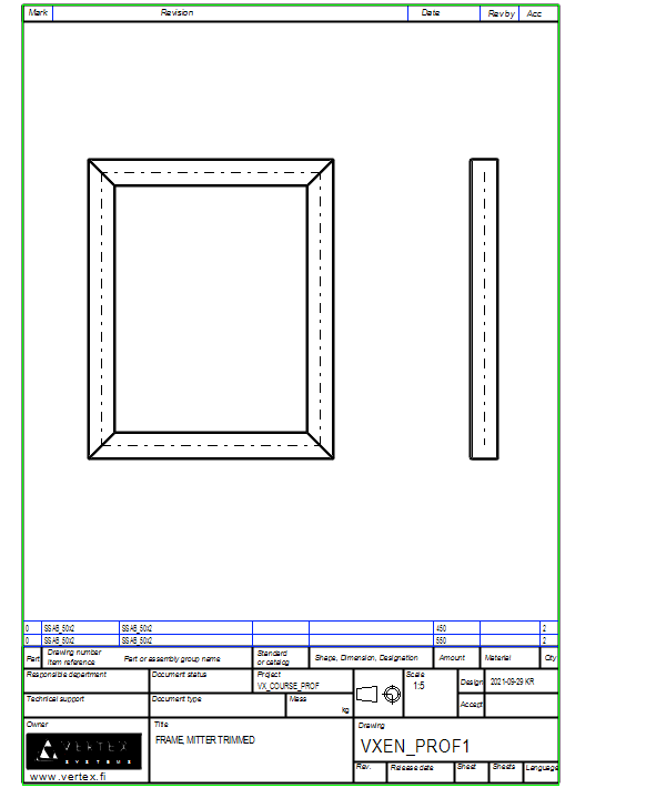 A list of parts is printed on the drawing, which includes the profile lengths in the Amount field.