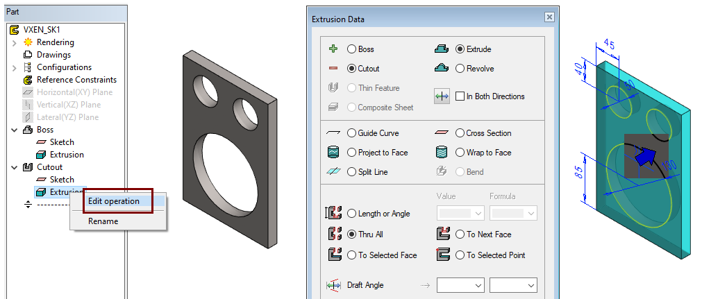 Select the Extrusion step and the right-click function: Edit operation.