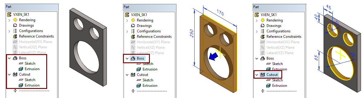 In the feature tree you will see the steps Boss and Cutout.