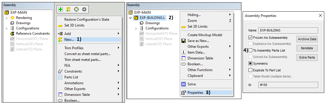 You have now created a new sub-assembly under the main assembly. The sub-assembly is visible on a different level on the assembly tree than the main assembly, in picture 2). Next, you will modify the properties of the building model: