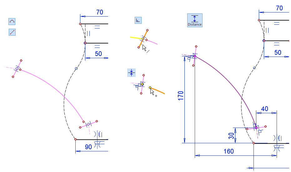 Place the upper arc tangential with the vertical control line (Tangential constraint).