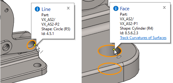 The program lists the cylinders and circles in the dialog and also draws the dimension in the model.