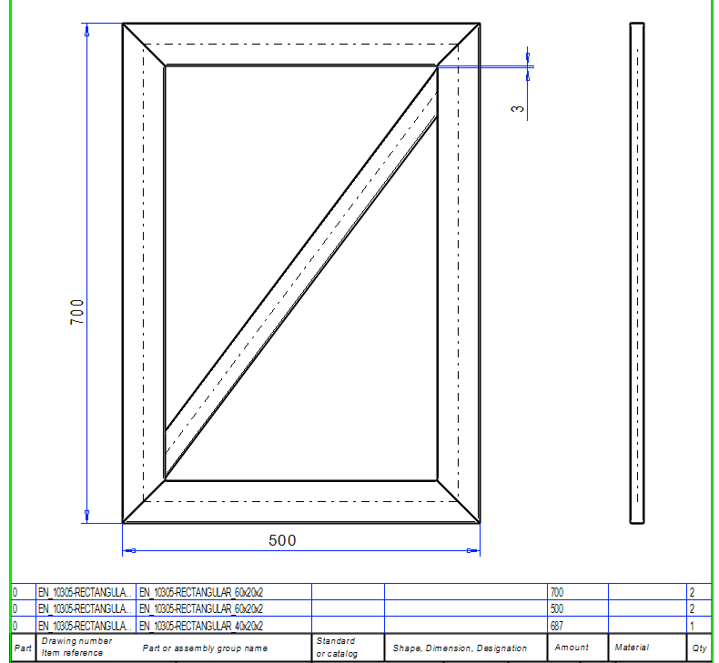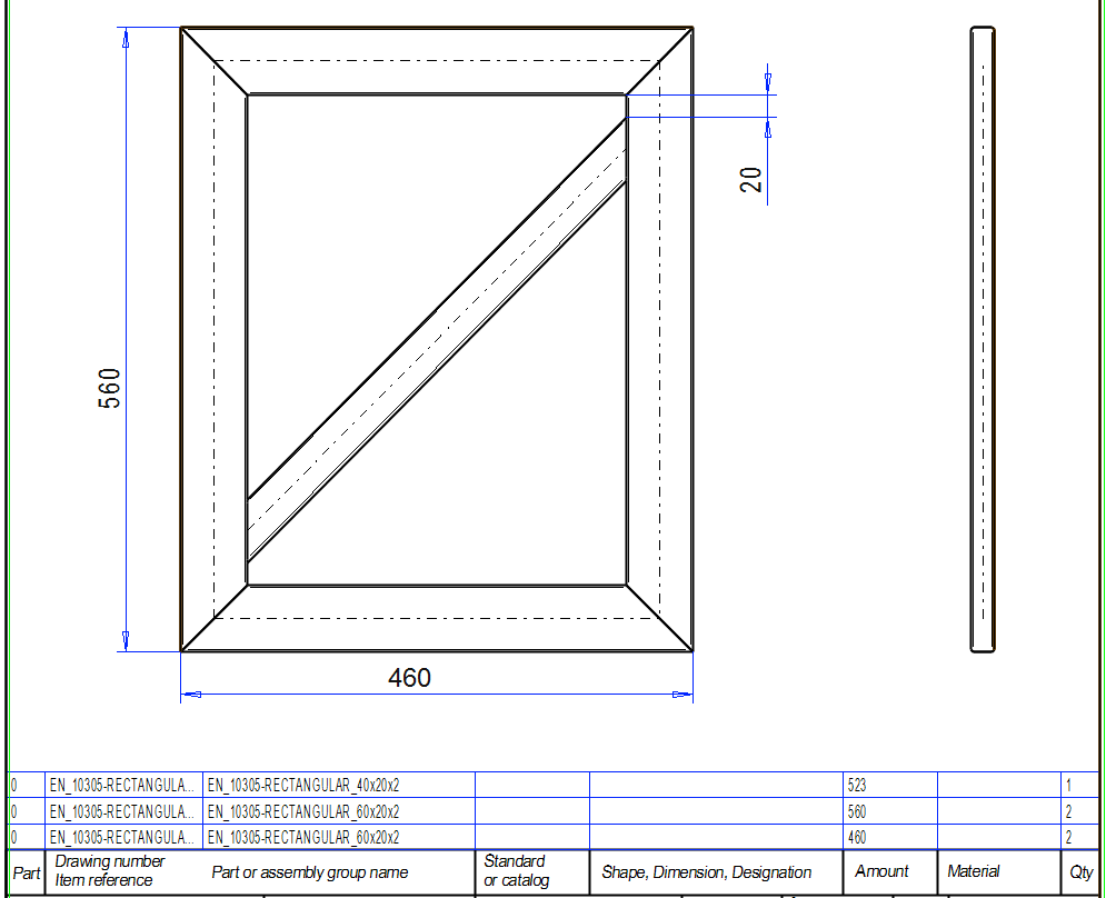 Note that we made a sketch for the dimensions 500 * 400, but that in the model the dimension of the frame becomes 560 * 460.