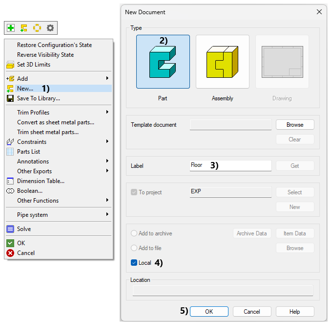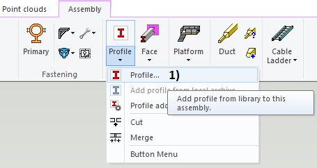 Select all six profiles from the model or assembly tree > Context-sensitive function: Save as assembly... > Type a label Steel-Beams and enable the check-box Local.