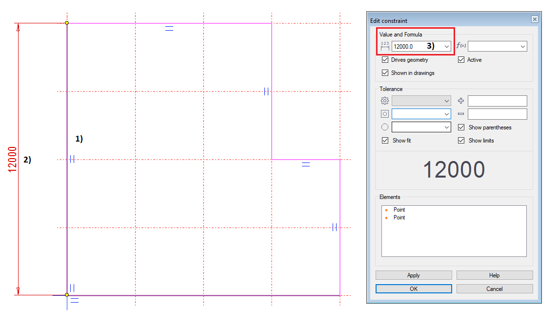 Change the extrusion direction (downwards from XY plane) by clicking the button Flip, in picture 1). Rotate the sketch for a better view, if needed.