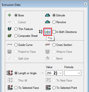 Type the extrusion length 250 to the field Length or Angle, in picture 2).