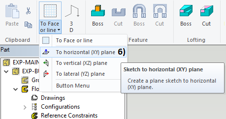 Ribbon: Start the function Sketch to face or line > To horizontal (XY) plane, in picture 6).