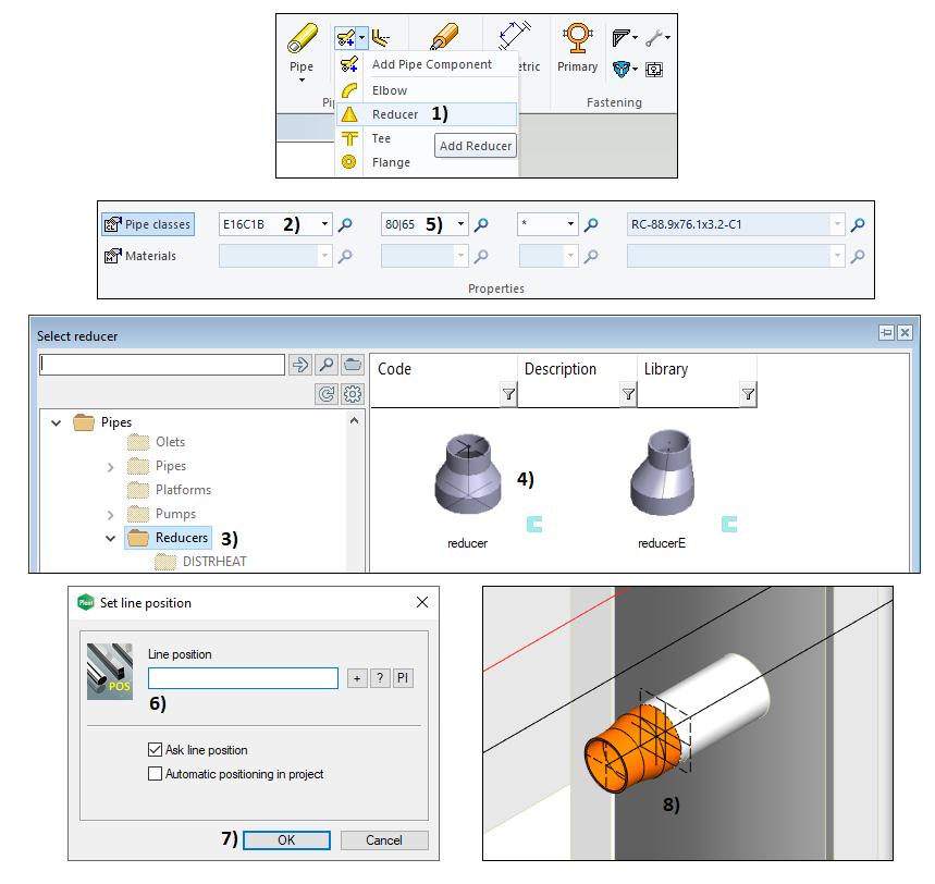 The program suggests a line position T001, NOZZLE-1 for the reducer. Clear the field and confirm the window by clicking the button OK, in picture 6) and 7).