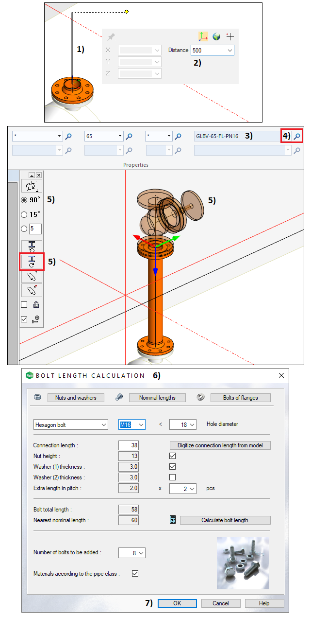The program automatically calculates the distance between the bolt surfaces of the flanges and proposes suitable fasteners.