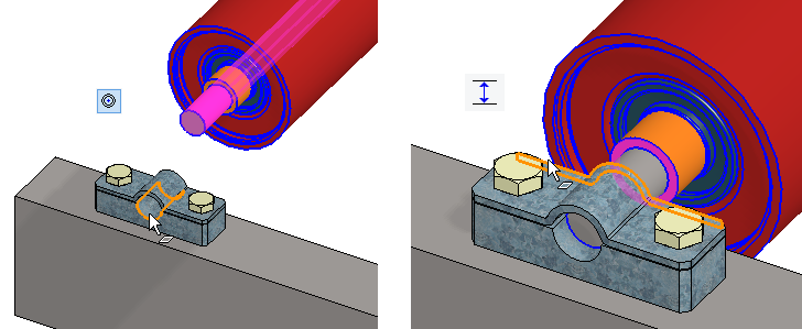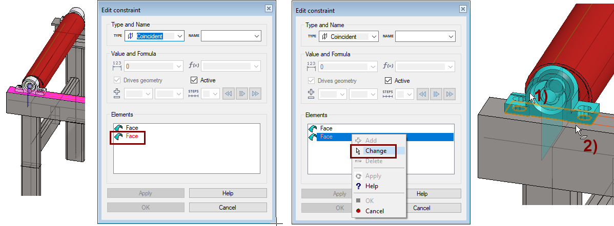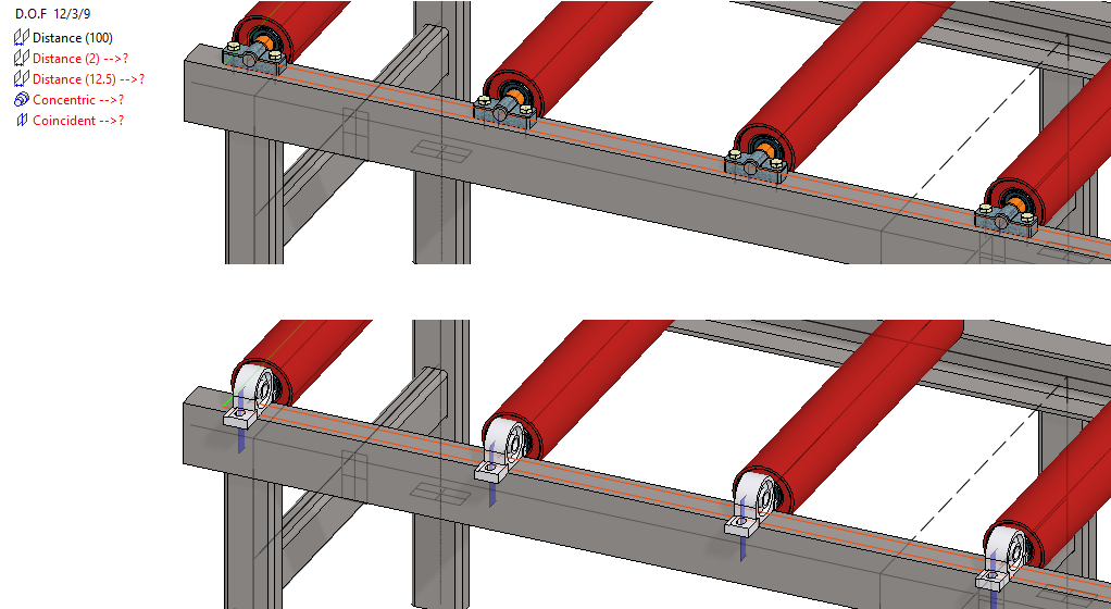 In this case, theConcentric constraint does not turn red. It is solely due to the fact that both conveyor rollers use the same shaft (VX_AS5-P3), so the counterparts (faces) are known.