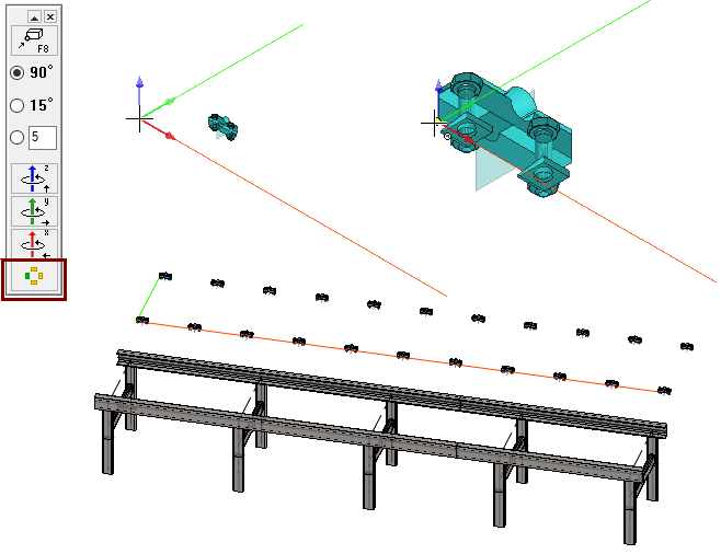 The auxiliary geometry associated with the series (Longitudinal red line and transverse green line) is available for positioning the series, i.e., lines can be part of constraints.