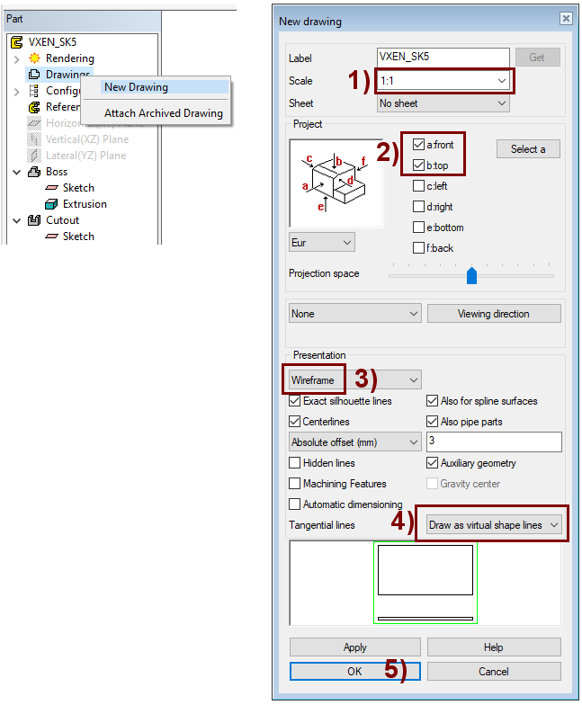 Vertex generates the requested projections and copies the model archive data to the drawing archive card.