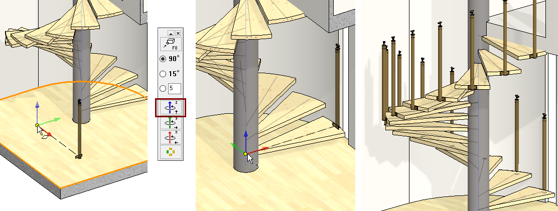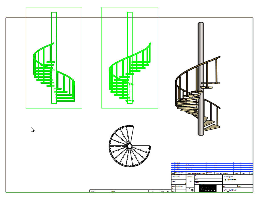 The spiral-shaped handrail is modeled by drawing auxiliary geometries. You can look the model by reading the model VX_AS6-P6.