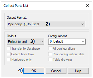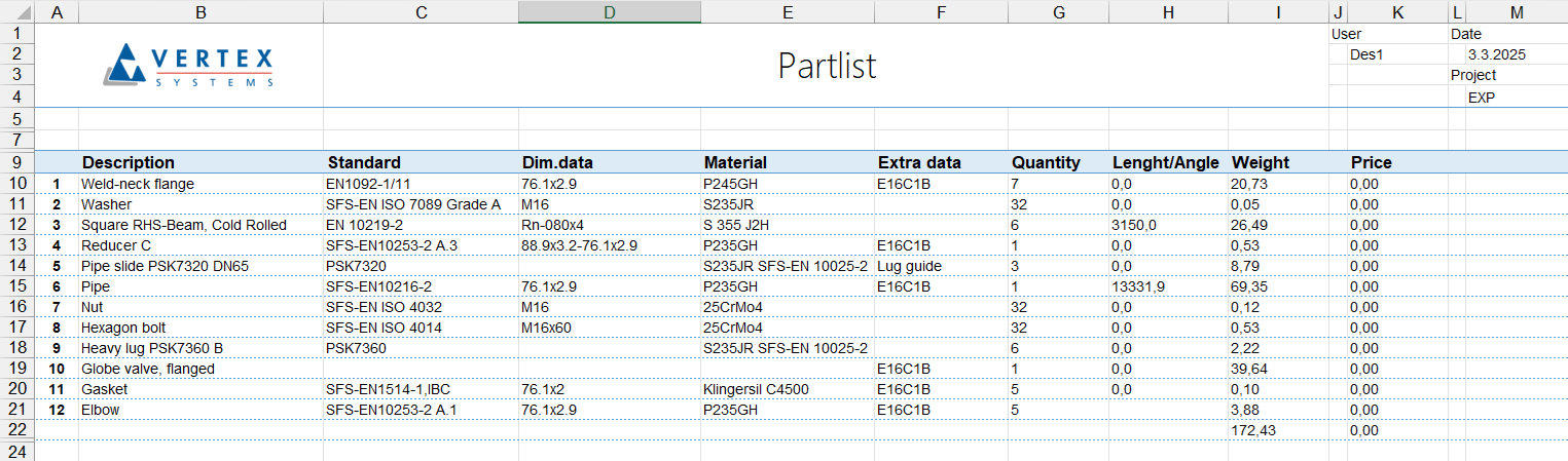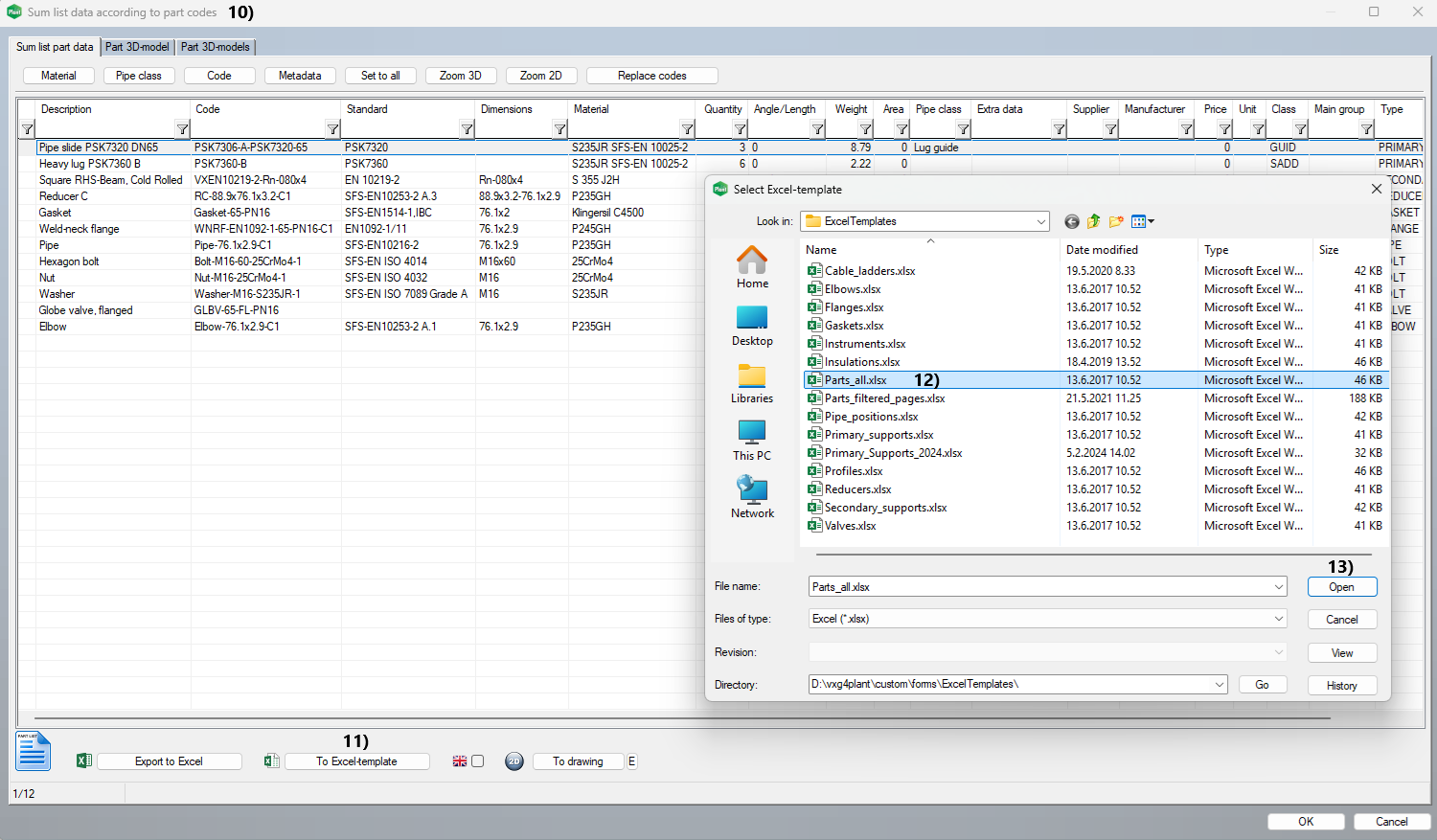 Export the list to the Excel file > Click the button To Excel-template, in picture 11) > Select the Excel template Parts_all.xlsx, in picture 12) > Open, in picture 13) > The Excel file opens.