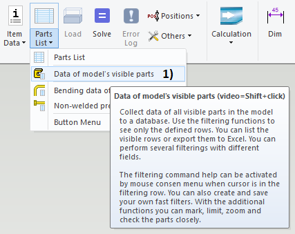 You can view the item data of the model's currently visible parts, modify them, and eventually export them to the Excel file.