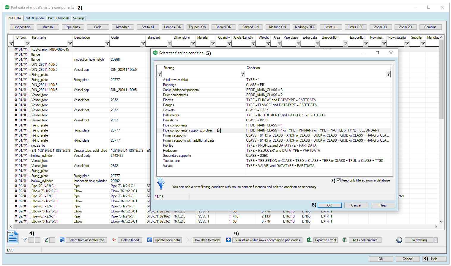 Click the grey box from the bottom left corner. That is a quick filter, in picture 4). > The window Select the filtering condition opens, in picture 5). > Select the row Pipe components, supports, profile, in picture 6) > Enable the check-box Keep only filtered rows in database, in picture 7) > Close the window by clicking the OKbutton, in picture 8).