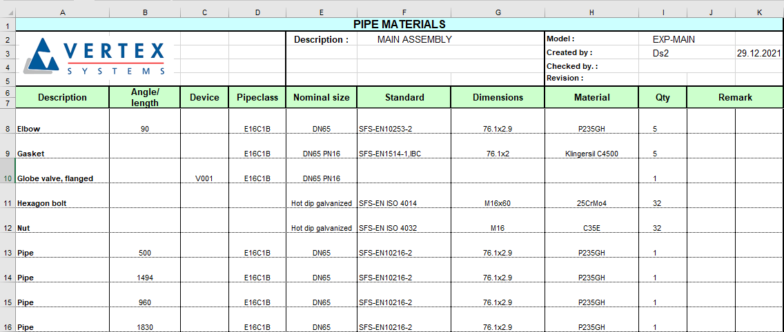 This list contains also primary supports and profiles from the secondary supports. Save the Excel file to a suitable place. Close the file after you have viewed it.