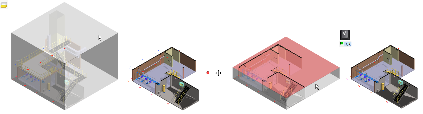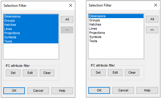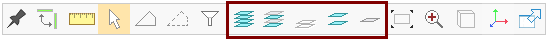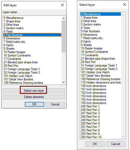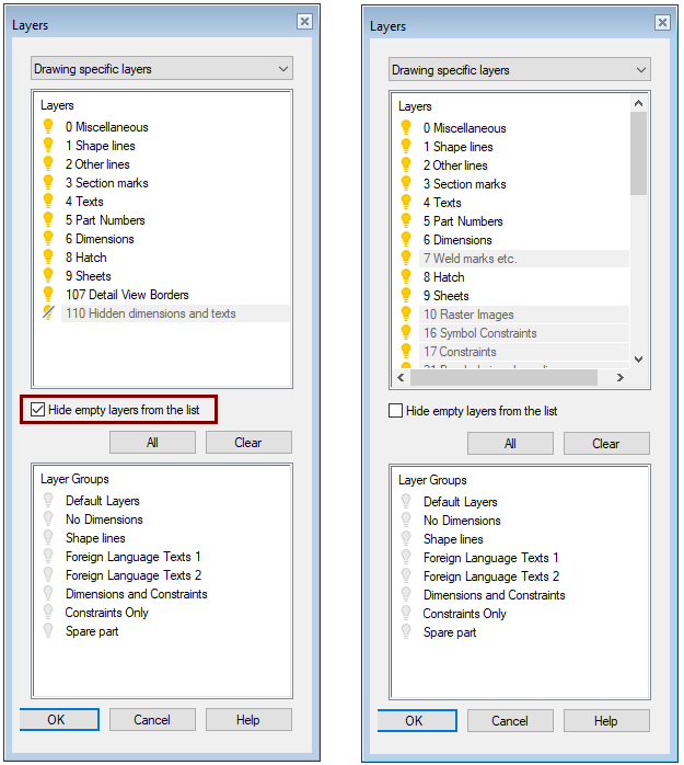 = All layer = All layers in the drawing are visible, except for layers defined as hidden layers (110 = Hidden dimensions and texts). = Select Layers from List = Opens a list where you can turn the layers on and off. = Faforite Layer Groups = The button is grayed out if no favorite level groups are defined.No favorite level groups have been defined in the delivery version. = Hide Layers = Click to an element in the drawing, such as text at level 4, to turn off level four and hide all (level 4) text. = Hidden Layers On/Off =Show or hide hidden levels.