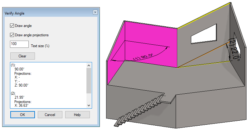 Select Draw angle projections to draw the angle dimensions along the main projections in the model.