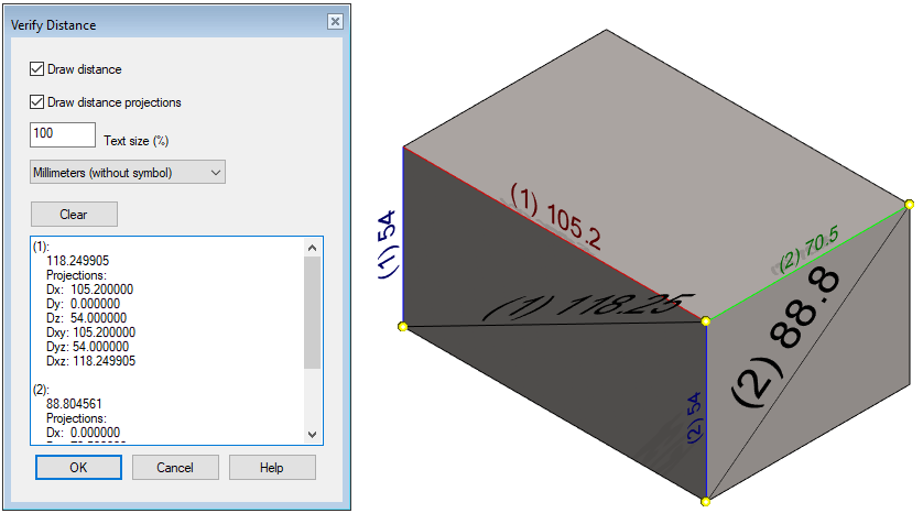 The program numbers the measured distances with a number in parentheses that appears in both the list and the model.