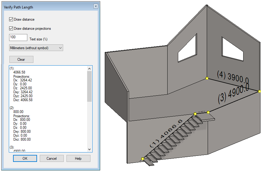 The program marks the elements in the model and draws the requested lines and dimensions.