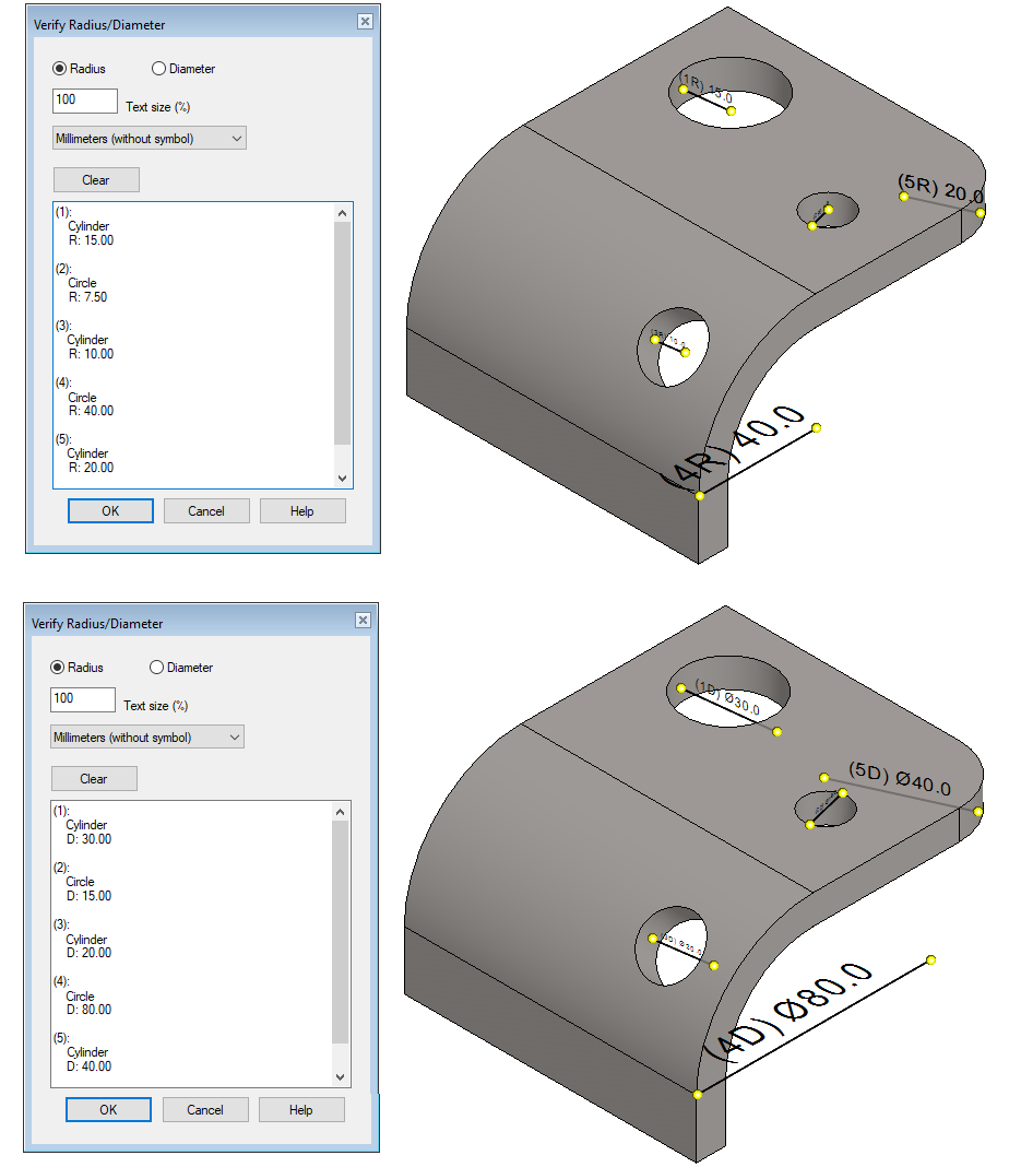 You can also click to a planar face, in which case the program measures the radii (or diameters of your choice) of the arcs at the edges and center of the surface and lists them.