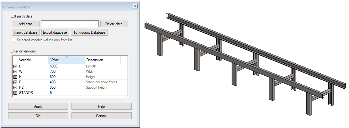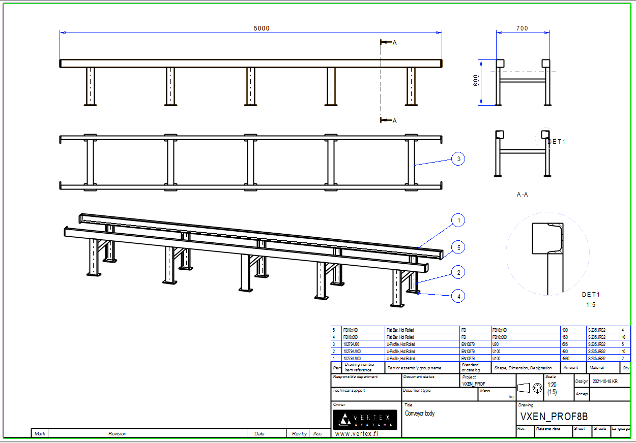 Because the profiles were placed at their corners, not their centers, the dimensions of the conveyor will be exactly the dimensions you enter in the dimension table.
