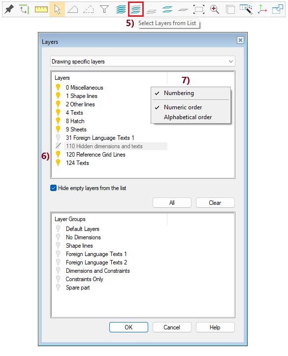 If your layer list does not show numbers and texts, right-click on the screen and activate the options Numberingand Numeric Order, in picture 7).