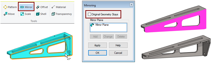 This function can be used with symmetrical part when you want to copy a feature (Boss or Cutout) by mirroring it on the other side of the part.