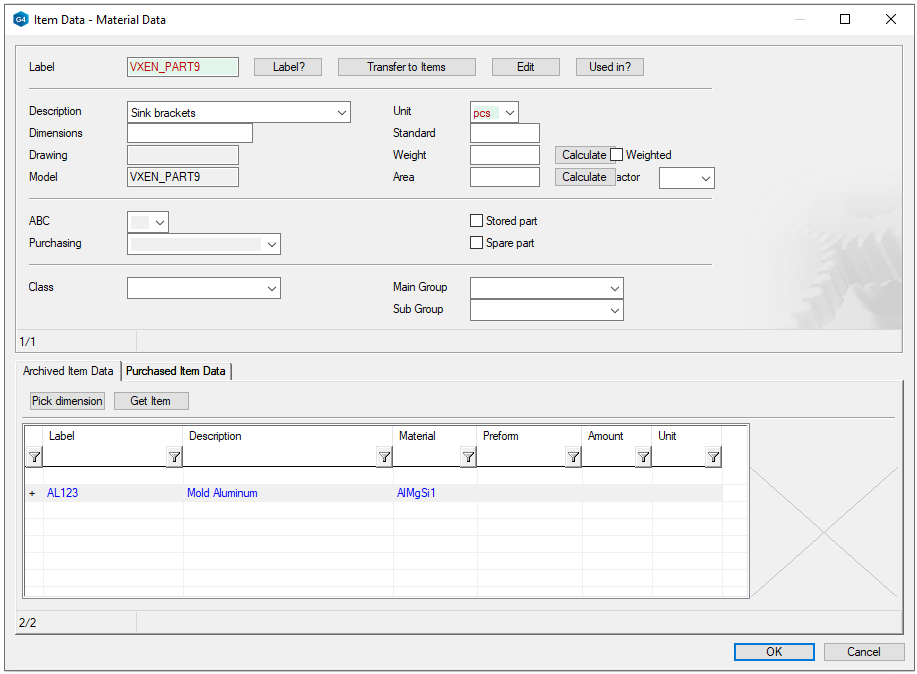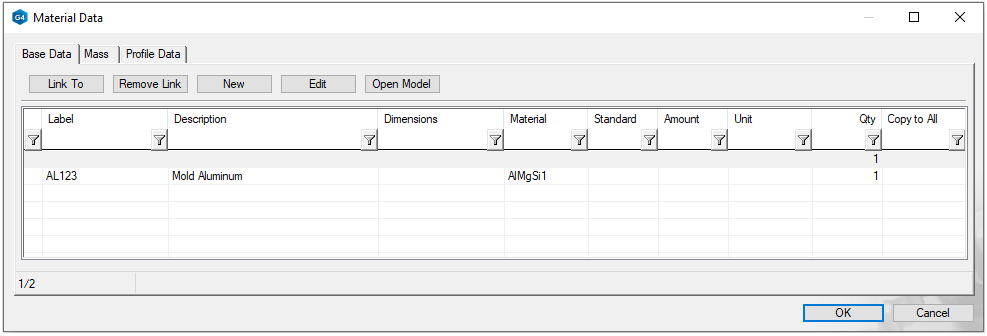 Ribbon Function (Tools) Material opens the Material dialog, where you can write manually or retrieve material information for the raw material.