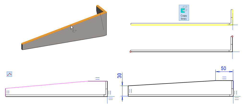 Click the lines from the geometry (shown in yellow) and the right-click function: Copy lines (Copy to Sketch Plane).