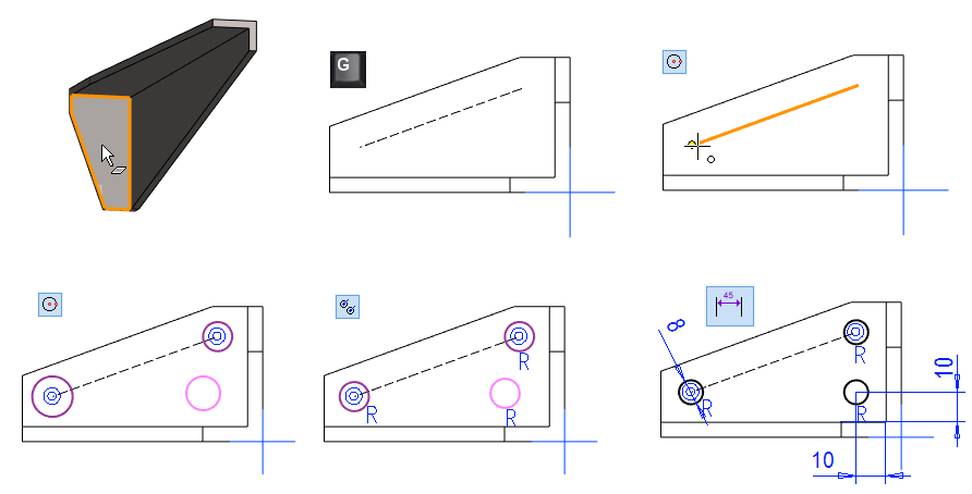 With the help of the guide line, you can control the shape so that the rounding added to the part is at a constant distance from the mounting hole.