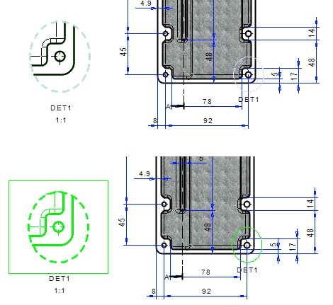 Unfortunately, the detail view projection activated in the drawing's feature tree cannot color the boundaries of the detail view.
