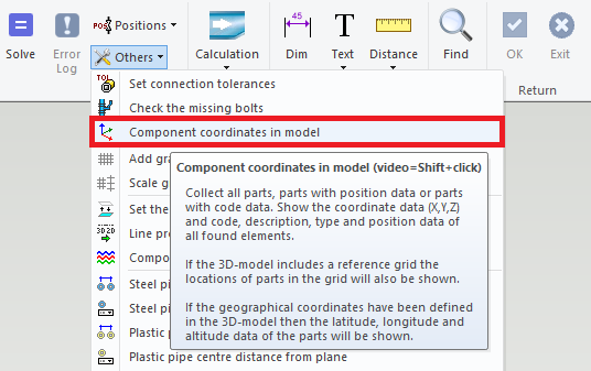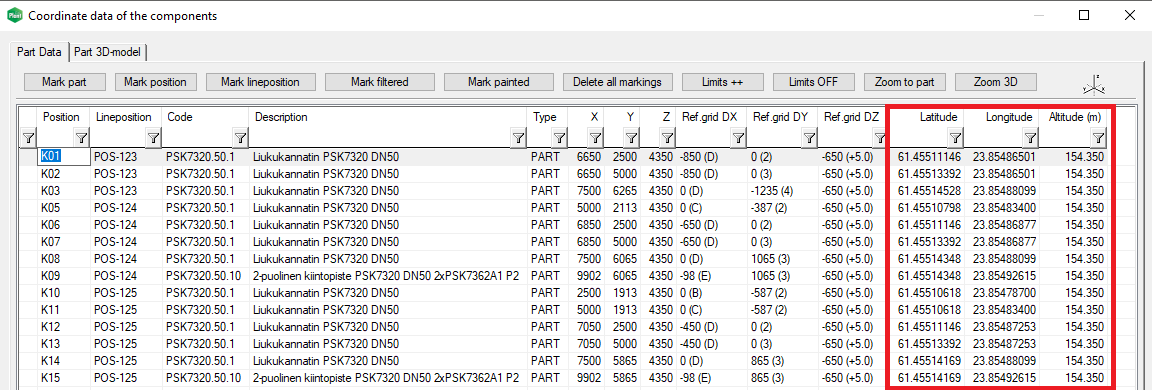 It's and it has been possible to define geographical coordinates of your 3D model. Now you can see the latitude, longitude, and altitude data of each part, when you use the function Component coordinates in model. The program also shows the normal coordinates of the part relative to the origin in the Vertex model, as well as the distances from the nearest module grid lines, if used. A new feature compared to previous versions is that you now get the coordinates of all parts of the model - even those without code or position information.