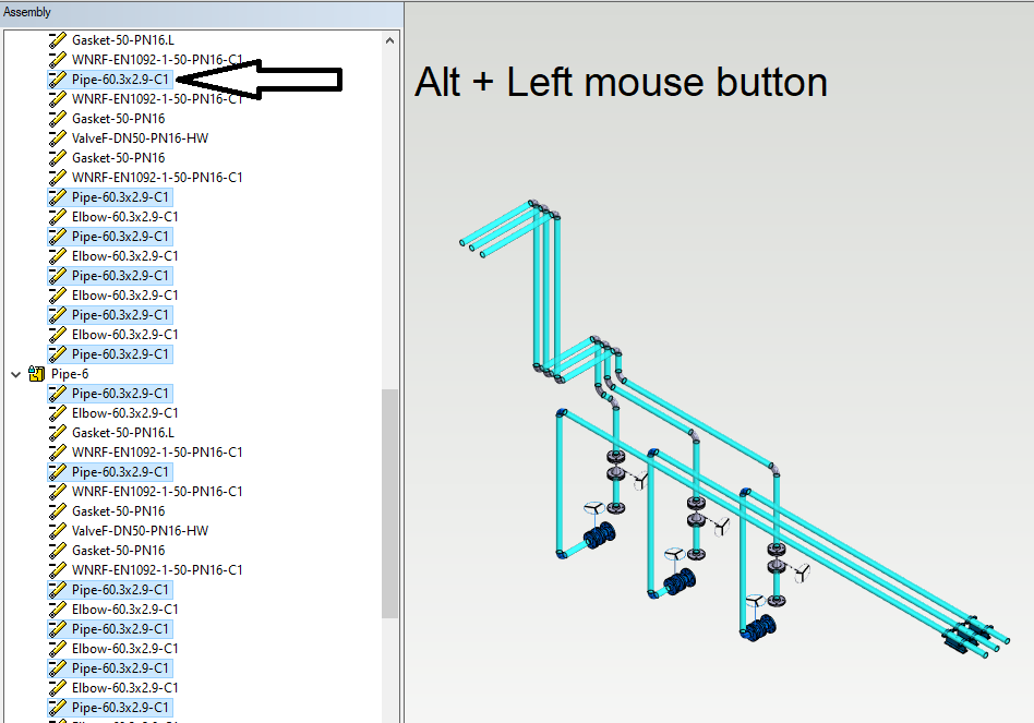 - Note: If you select a part in the model window at the bottom of the Alt key, the assembly branch that contains the part is selected.(PLANT-3764, PLANT-3839)
