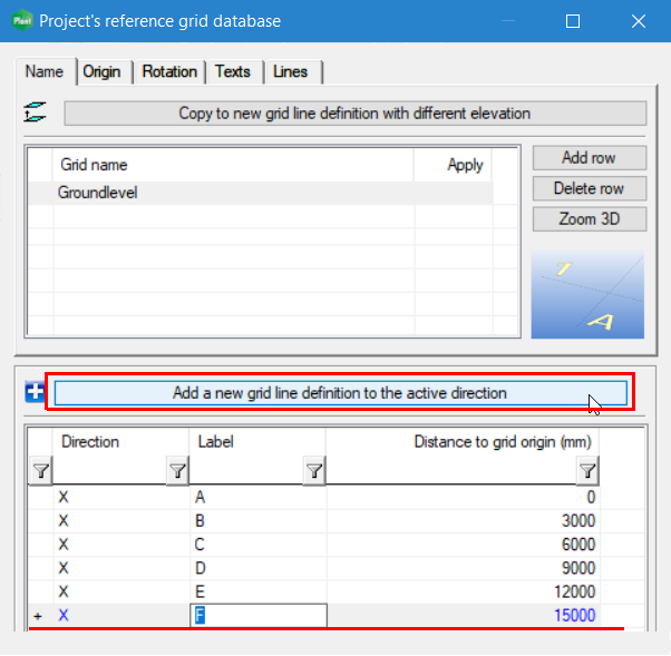 When using function Add a new grid line definition to the active direction programs adds automatically a new definition line at end of the active direction. The distance is calculated according to last two definition lines. (PLANT-3685)